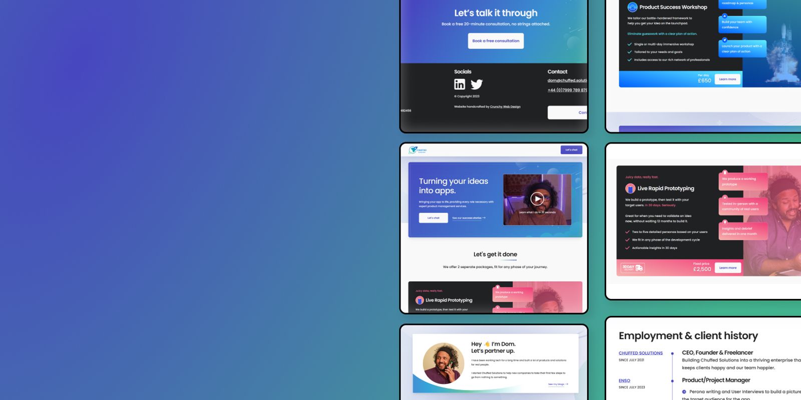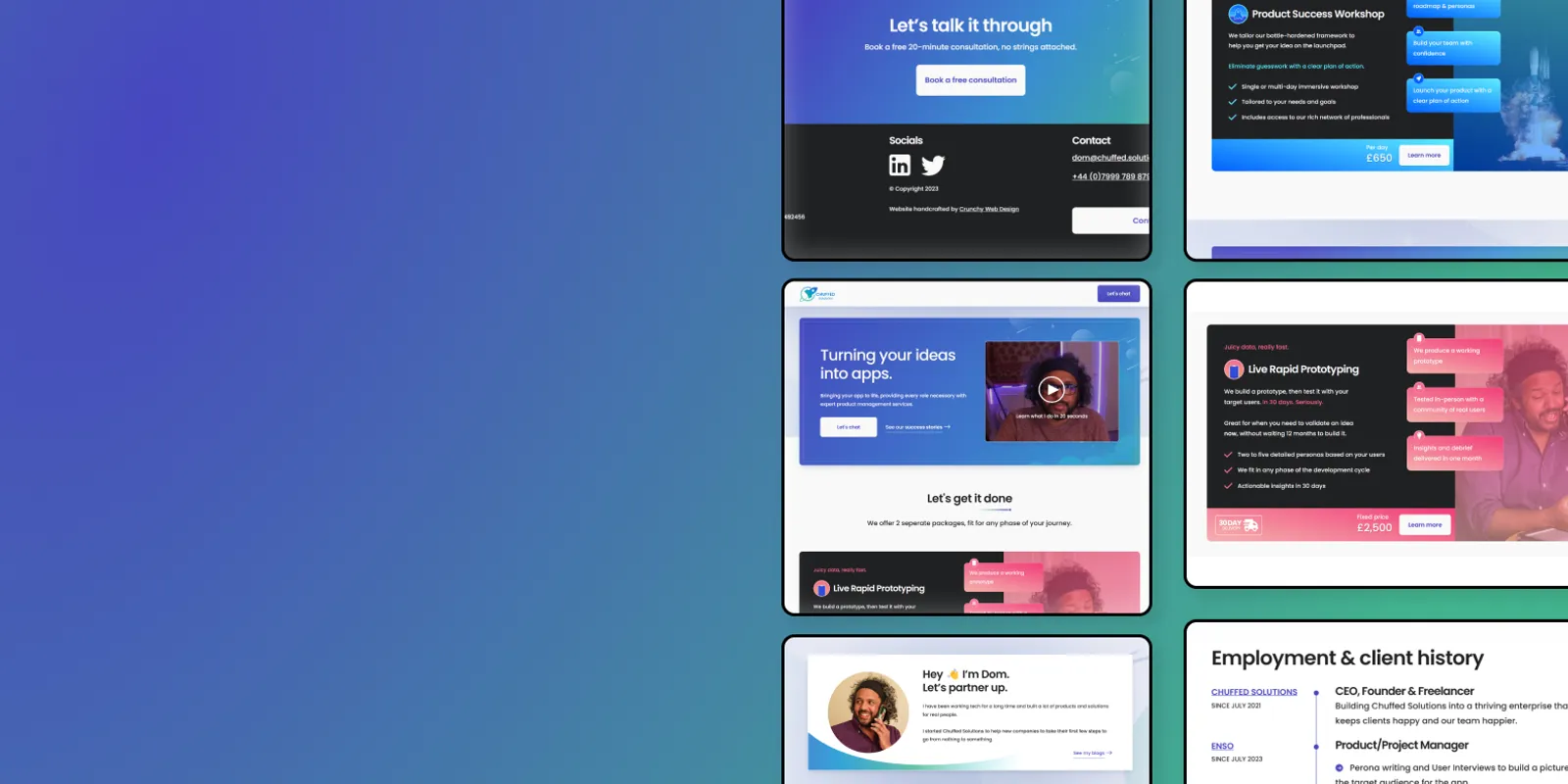 Part of the challenge was positioning Dom as a consultant rather than a freelancer or agency. We landed on focusing on his two “productized” services: Live Rapid Prototyping and Product Success Workshop. They would be packaged up and sold as fixed prices. We took inspiration from Google sites